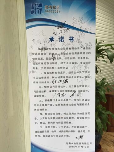 為貫徹落實資本市場誠信建設工作,提高市場參與主體的誠信意識,優(yōu)化市場誠信環(huán)境,夯實市場穩(wěn)定健康發(fā)展的誠信基礎,根據(jù)北京證監(jiān)局《關于在北京轄區(qū)集中開展資本市場誠信建設宣傳活動工作的通知》,渤海水業(yè)股份有限公司開展了以“誠信經(jīng)營、誠信融資”為理念的誠信建設宣傳活動。現(xiàn)將活動情況總結如下: